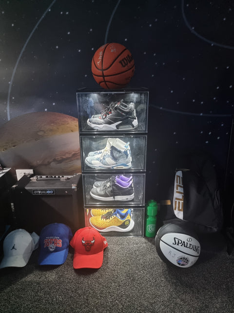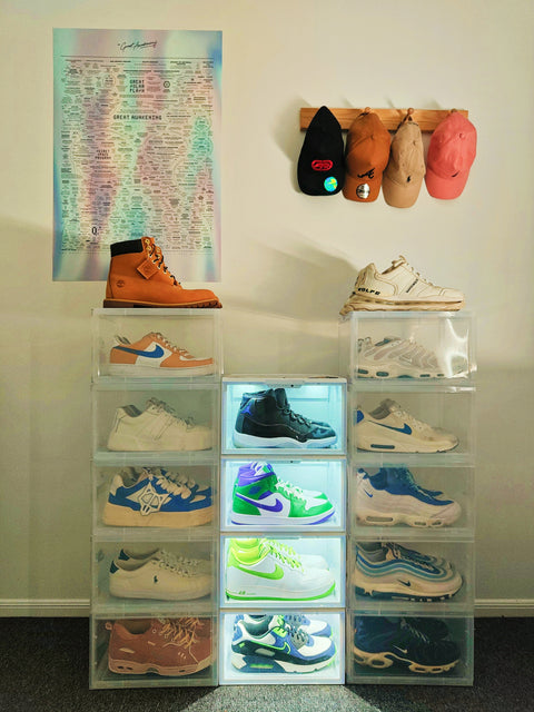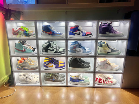 Display your sneakers in all their glory with our stackable, clear side display sneaker cases with built in LED lights. Built with premium materials, each case is built with a tight magnetic enclosure to protect your sneakers from dust, making it a great combination of shoe storage and clear display case.